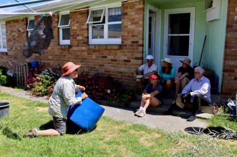 Before lunch, Catherine led a workshop on how to set up a wicking bed.  Some variation of a wicking bed design is a fantastic solution to keep plants happy in a dry summer, especially if you are away for weeks at a time.  Google “wicking beds” to find out more design possibilities.  What we did was to use a 200 litre plastic barrel from the recycle container place in Greerton, cut in half.  The bottom of the barrel acts as a water reservoir and is filled with a Nova flow drainage pipe inserted in a muslin sleeve (to prevent the sand clogging the holes). This pipe was coiled in the bottom of the barrel and sand poured on top up to the level of the outlet pipe.  Another pipe is inserted into the Nova flow pipe to be able to fill the bottom with water. Then a layer of weed mat is placed over the sand and the barrel filled with compost ready to plant.  Catherine suggested that several wicking beds could be set up one under another for a cascade effect.